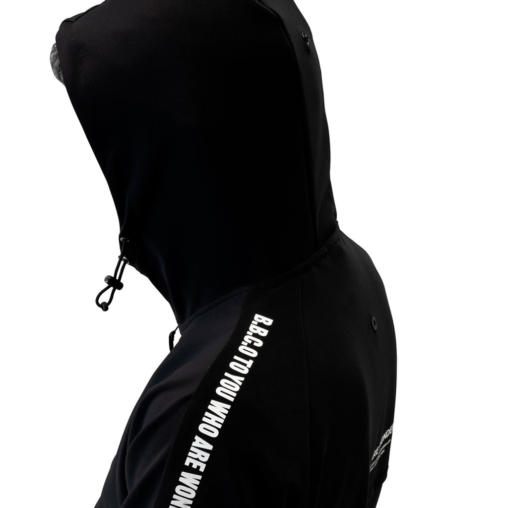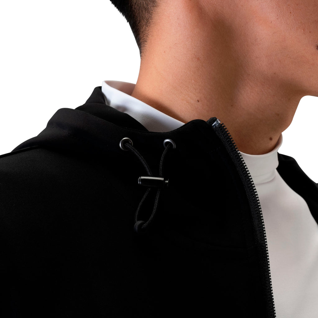 フード、裾元にコードが付いており、必要に応じて絞ることも可能。
