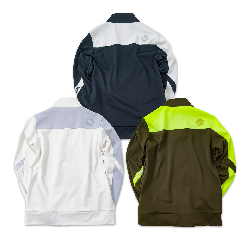 アシメトリーの配色が目を引く、HALF ZIP UP MOCK NECKで、フロントのZIPと胸のメタルパンダプリントは、光沢のあるシルバーカラーが印象的です。